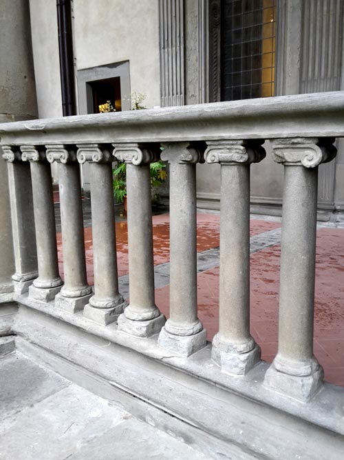 (Foto © Marco Badiani) - Dettaglio delle colonnine in pietra serena che si trovano all’ingresso del loggiato. Si nota lo sfaldamento della pietra usurata dal tempo e dagli agenti atmosferici.