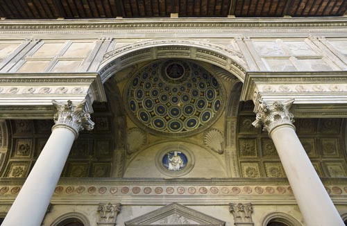 Il loggiato antistante la cappella è al contrario ricchissimo di decorazioni: la sua pianta ripropone in parte le proporzioni di quella della cappella e come questa è sormontata da una piccola cupola: quest’ultima è decorata con maioliche attribuite a Luca della Robbia, mentre le colonne e gli altorilievi che ricoprono le volte sono in terracotta e pietra serena. Si tratta quindi di materiali delicati, che si stanno inevitabilmente deteriorando, e il cui restauro non può attendere a lungo.