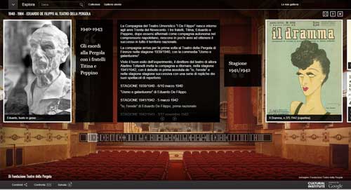 Ma il Google Art Project è dal 2012 anche un archivio di mostre virtuali, dedicate non solo a grandi temi dell’arte ma anche a fenomeni storici, politici e di costume. Grazie alla collaborazione con prestigiose istituzioni come la Fondazione Mandela, lo Yad Vashem e l’Istituto Luce nascono così mostre digitali dedicate all’Olocausto, all’Apartheid ma anche alla Dolce Vita. A queste oggi si aggiunge una esclusiva mostra creata proprio in collaborazione con il Teatro della Pergola, dedicata al grande Eduardo de Filippo che con questo luogo aveva un rapporto speciale: ecco quindi che sullo schermo del nostro computer si materializzano manifesti, documenti autografi (alcuni inediti), foto e filmati che raccontano l’attività di Eduardo alla Pergola tra il 1940 e il 1984.