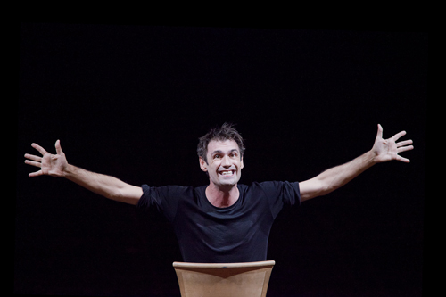 A questo sapiente lavoro di rimandi, sintesi e accostamenti dà corpo Fabrizio Gifuni, con una performance che è ritmo e forza e in cui corpo, voce e parole diventano – o per meglio dire tornano ad essere – una cosa sola. Lo spettatore non può che farsi trascinare in questo vortice, che stupisce, coinvolge e innesca cortocircuiti storici a tratti amaramente esilaranti. Un vero rituale laico, come nell’intenzione di Gifuni, in cui raccogliersi tutti insieme. Una messa in scena essenziale e asciutta, ma di grande impatto, dove la fisicità dell’attore è supportata da giochi di luci semplici quanto efficaci.