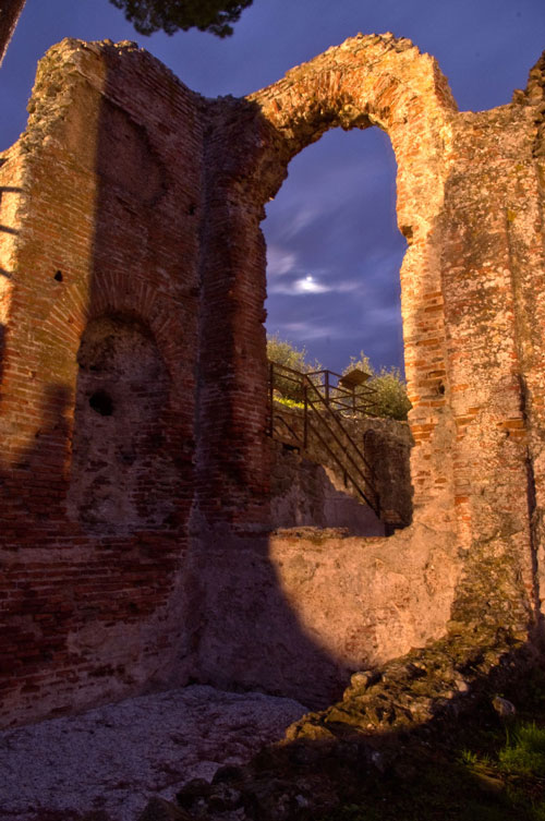 - La luna vista attraverso le rovine di Massacciuccoli romana, uno dei siti archeologici coinvolti nell’iniziativa delle Notti dell’Archeologia 2015