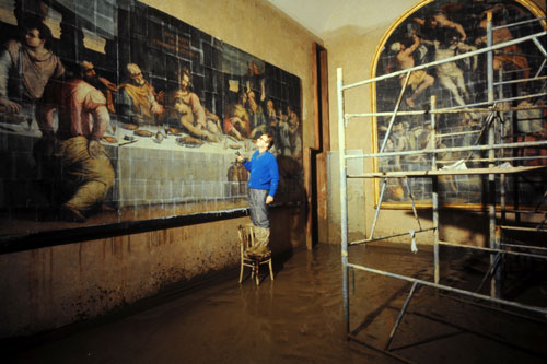 Molto si è parlato nelle ultime settimane delle celebrazioni per il 50° anniversario dell’alluvione che nel 1966 devastò Firenze. Sono tante le immagini di allora entrate nella memoria collettiva, ma quelle che riguardano il salvataggio del patrimonio artistico destano ancora oggi particolare commozione. Non a caso nell’immaginario di tutti fu proprio un’opera d’arte il simbolo della catastrofe: il celebre Cristo del Cimabue conservato in Santa Croce che Paolo VI definì la “vittima più illustre” dell’alluvione. Come il più celebre crocifisso anche l’Ultima cena fu letteralmente travolta dall’acqua e dal fango che la notte tra il 3 e il 4 novembre travolsero Firenze.